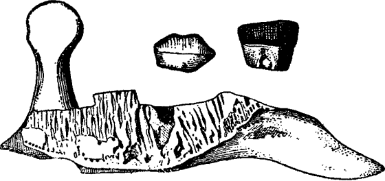 Рис. 11. Внизу — нижняя челюсть траходона; видны последовательные ряды зубов. Сверху — вид сверху и сбоку на зуб миледафуса двухстороннего (По Осборну и Лэмбу).