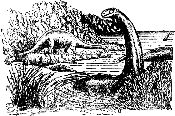 Теперь все большие музеи Америки имеют полные или почти полные скелеты этих созданий, самых крупных животных, которые когда-либо жили на суше. Великолепный экземпляр бронтозавра (рис. 13) в Американском музее в Нью-Йорке имеет более восемнадцати метров в длину. Ничто так не воспламеняет воображение, как посещение зал, где хранятся теперь эти вымершие ящеры.