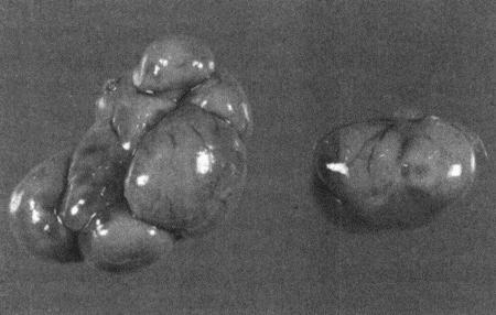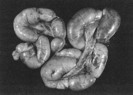 Яичники суки при пиометре (около 6 недель после течки). Характерно отсутствие желтых тел (см. Приложение)