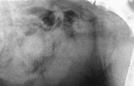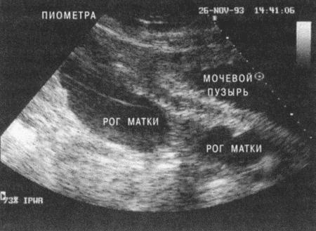 При рентгенографии в латеральной проекции (фиг. 4.17) увеличенная, наполненная жидкостью матка выявляется как затемнение в венитральном отделе брюшной полости. Кишечник смещен, и расстояние между мочевым пузырем и прямой кишкой увеличено. Матка почти всегда увеличена. Следует отметить, что беременная матка между 4 и 6 неделями, т. е. на стадии, когда еще не заметны скелеты зародышей, может давать картину, сходную с пиометрой. Одним из существенных недостатков рентгенографии является необходимость применения седативных препаратов.