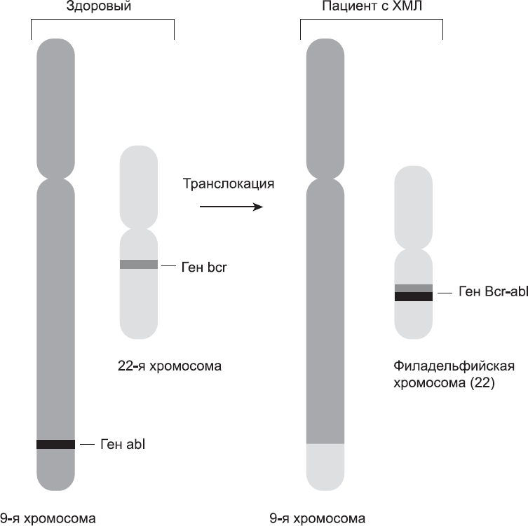 Среди самых первых вирусных онкогенов и клеточных протоонкогенов, открытых после src, был ген v-abl, вызывавший у мышей лейкоз Абельсона, а также его клеточный аналог, ген c-abl. Подобно c-src и другим, c-abl также присутствует в человеческом геноме. Когда ученые выяснили, что ген c-abl относится к 9-й человеческой хромосоме и та же хромосома участвует в транслокации, описанной Роули при ХМЛ, они задумались: могут ли быть связаны эти факты? Возможно ли, что у больных ХМЛ 9-я хромосома повреждалась вблизи от гена c-abl?