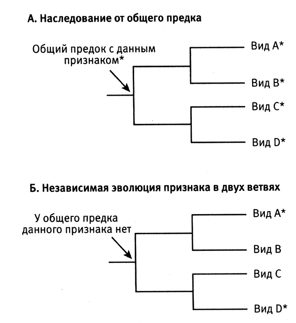 Рис. 6.1. Альтернативные варианты появления общих признаков у разных видов. Разные виды организмов могут обладать общим признаком (звездочка), если они унаследовали его от общего предка (A) или в результате независимой эволюции этого признака у данных видов после их отделения от общего предка (Б). Рисунок Лианн Олдс.