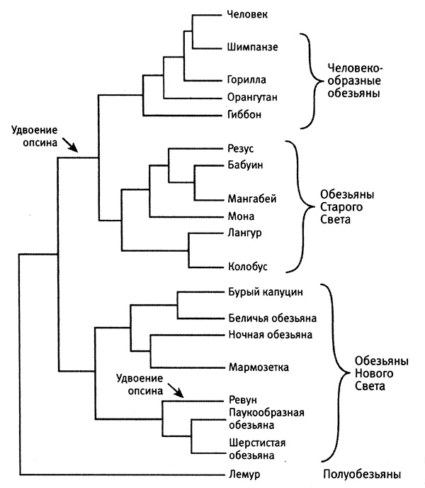 К счастью, чтобы докопаться до истины, мы не обязаны полагаться лишь на информацию, заключенную в эволюционном древе. Удвоение генов оставляет в ДНК свои следы. Анализ последовательности и организации современных генов опсинов в ДНК приматов Старого Света, а также ревунов и других обезьян Нового Света проливает свет на их историю. Из текста ДНК однозначно следует, что удвоение гена опсина у приматов Старого Света и у ревуна — несвязанные события. Мы можем это утверждать, поскольку в этих двух случаях размеры удвоенных фрагментов ДНК разные. У приматов Старого Света вне кодирующей последовательности каждого из двух генов имеются одинаковые последовательности длиной по 236 пар оснований. Это означает, что при создании гена средневолнового опсина была удвоена еще и прилежащая последовательность из 236 пар оснований. А у ревуна к удвоенным генам опсина примыкают гораздо более протяженные некодирующие участки. Такое могло произойти лишь в том случае, если удвоение гена опсина у ревуна произошло независимо от удвоения гена опсина у нашего с вами предка.