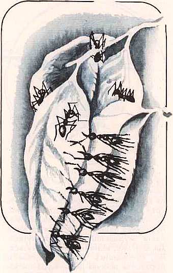 В Африке и тропической Азии живут муравьи, прозванные портными за то, что свои дома не строят, а сшивают из листьев в прямом смысле этого слова. Но прежде чем сшить края листа, их надо как-то сблизить. Казалось бы, для муравьев это непосильная задача — от края до края листа муравьишке не дотянуться. Да, одному, конечно, не дотянуться. Но, сцепившись друг с другом и образовав живую цепь, муравьи закидывают один ее конец на край листа, второй конец — на противоположный, постепенно стягивают их и удерживают в таком положении. В это время другие муравьи выносят из укрытий личинок, у которых имеются большие и хорошо развитые шелкоотделительные железы, и начинают шить, прикасая голову личинки то к одному, то к другому краю. Личинки выпускают паутину, и края листа быстро скрепляются.