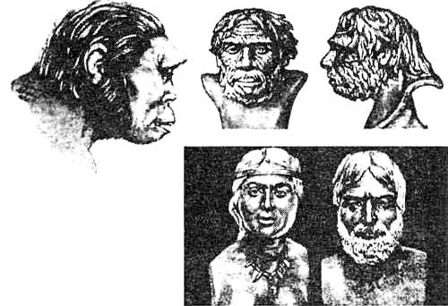 Наш замечательный ученый и скульптор М. М. Герасимов умел по черепам восстанавливать облик давно умерших людей. Здесь его реконструкции питекантропа (наверху слева), неандетальца анфас и в профиль, а также кроманьонца, мужчины и женщины (внизу).