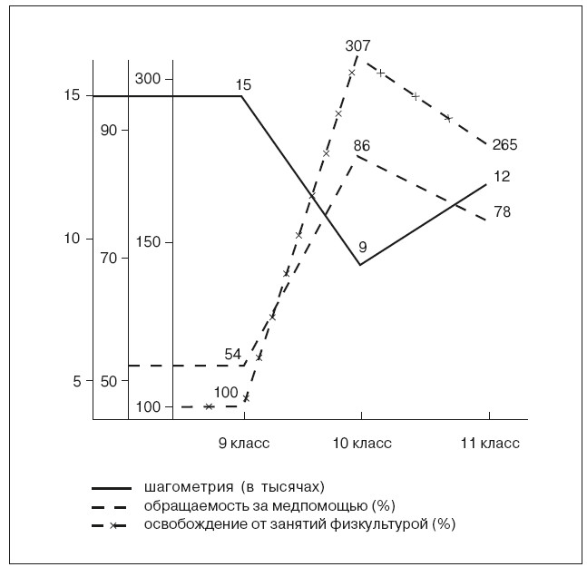 В частности, проведенное нами медико-педагогическое наблюдение за учащимися гимназии физико-математического профиля при СПбГУ показало, что ученики 9 класса (первый год обучения в гимназии) совершают от 12 000 до 20 000 локомоций (по данным шагометрии), в 10 классе 5000-12 000 ив 11 классе – от 10 000 до 15 000 (рис. 62). Анализ функций сердечно-сосудистой системы свидетельствует, что за трехлетний период обучения у детей как в состоянии покоя, так и при физических нагрузках наблюдается тенденция к тахикардии, развитию гипотензивных реакций и снижению мышечной работоспособности.