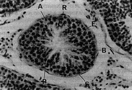 Поперечный срез семенного канальца кобеля: А-сперматогонии (А), В-сперматогоний (В), округлые сперматиды (R), продолговатые сперматиды (Е), первичные сперматоциты (Р), клетки Сертоли (S) (окрашивание нитрозин-эозином Н &Е)