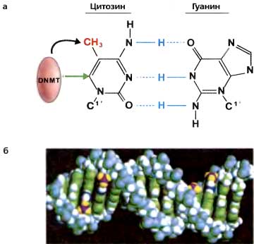 (а) добавление метильной группы (красный цвет) в положении 5 пиримидинового кольца цитозина (черная стрелка) стерически не интерферирует со спариванием оснований ПС (голубые линии). ДНК-метилтрансферазы ковалентно связываются с углеродом в положении 6 (зеленая стрелка) во время переноса метильной группы (б) Модель В-формы ДНК, метилированной по цитозинам в двух самокомплементарных последовательносях CpG. Спаренные метальные части (пурпурный и желтый цвета) лежат в большой бороздке двойной спирали