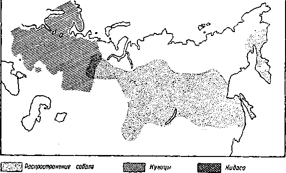 Рис. 12. Карта распространения куницы, соболя и кидаса (по Огневу).
