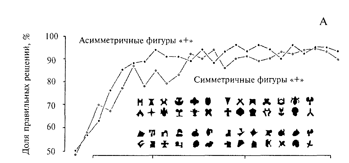 Еще одним примером обобщения абсолютного признака может служить способность голубей научиться узнавать стимулы в зависимости от их симметрии или асимметрии. В работе немецкого ученого X. Делиуса (Delius, Habers, 1978) голубей обучали отличать двусторонне симметричные стимулы — различные геометрические фигурки — от асимметричных (рис. 5.4). В параллельных сериях экспериментов у них вырабатывали дифференцировочные УР, подкрепляя симметричные и не подкрепляя асимметричные стимулы. У втором группы голубей положительными были асимметричные стимулы, а отрицательными — симметричные (рис. 5.4А).
