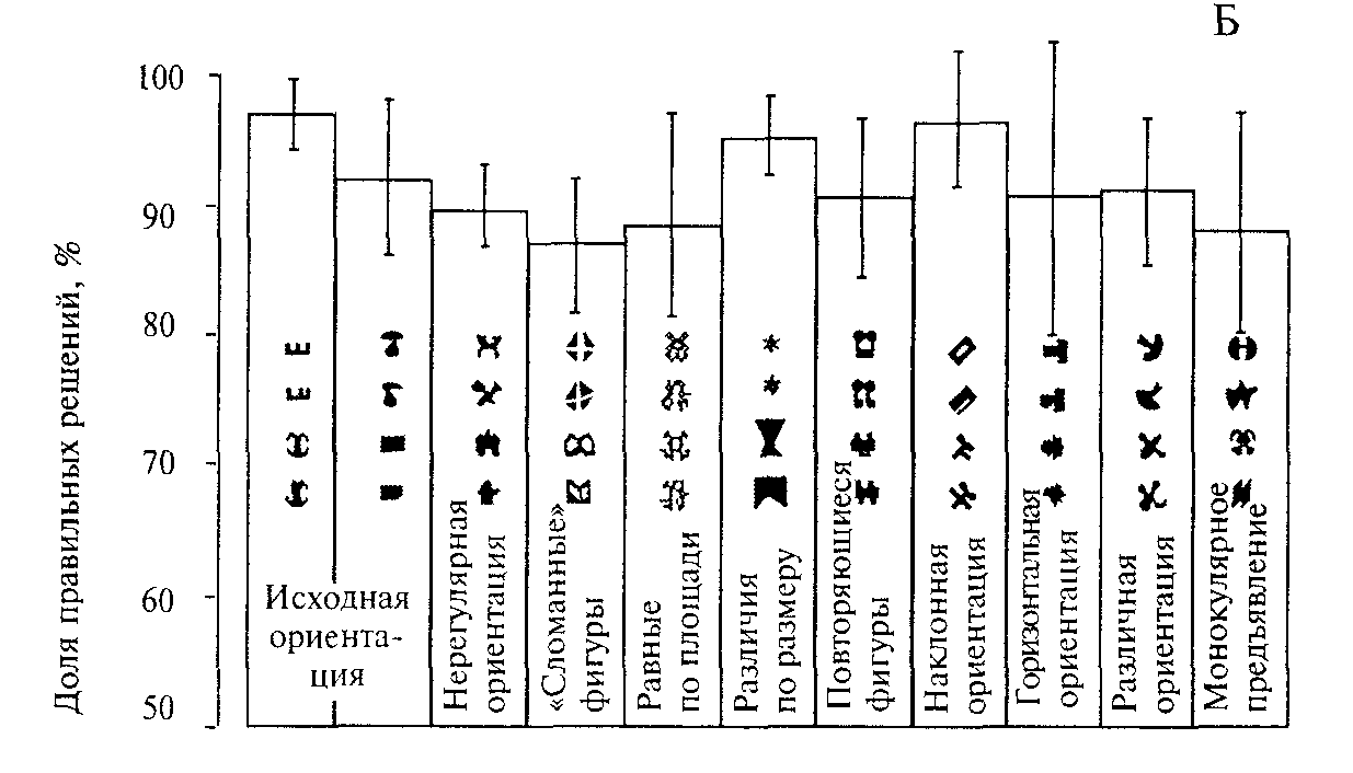 А — динамика правильных выборов при обучении голубей выбору симметричных и асимметричных значков, различавшихся в последовательных сериях по конфигурации. Птице начинали предъявлять новую пару стимулов после того, как выполнение теста достигало 80 %-го критерия. По оси абсцисс — серии опытов, по оси ординат — доля правильных решений в %. Б — высота столбиков показывает успешность выбора в тестах на перенос, т. е. при предъявлении новых пар фигур другой ориентации, размера и т. п. Вертикальные линии на столбцах — ошибки средней.