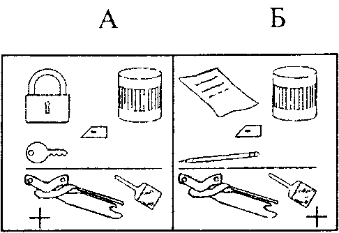 В одном из опытов (рис. 5.5А) ей показывали замок и ключ, рядом располагали банку с гуашью, между ними помещали хорошо знакомый Саре знак тождества, а для выбора предлагали консервный нож и кисть — предметы, которыми она также умела пользоваться. В этом случае она без колебаний выбрала консервный нож, потому что он выполнял функцию, аналогичную ключу — тоже «открывал» (банку). Однако, когда ей продемонстрировали лист бумаги и карандаш, предложив выбрать из тех же двух предметов «подходящий» для банки с гуашью, Сара столь же уверенно указала на кисть, которая по своим функциям в данном сочетании была аналогична карандашу.