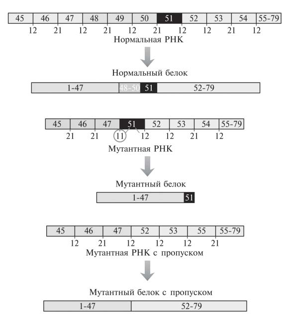 Рис. 17.6. Схематическое изображение ключевой области, где мутация в дистрофиновом гене может приводить к появлению существенно укороченной белковой молекулы из-за сдвига в системе аминокислотного считывания. Этот сдвиг (в данном случае) происходит, когда ДНК утрачивает кодирующие аминокислоты участки, обозначенные номерами 48-50. Чтобы поддерживать нужный характер считывания, каждое число, написанное под каждой границей участков, должно делиться на 3. Если добиться того, что в мутантном гене будет пропускаться при считывании и участок 51, нормальную последовательность считывания удастся восстановить. Для простоты все участки, кодирующие аминокислоты, показаны как прямоугольники одного размера, хотя на самом деле они отличаются по размерам.