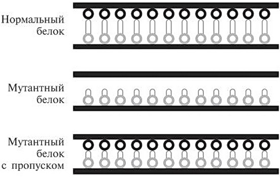 Как мы уже знаем, генетический код, задающий аминокислоты, считывается блоками по 3 нуклеотидных основания. Когда, как это происходит в нормальном гене, нужные участки, кодирующие аминокислоты (эти участки, если помните, называются экзонами), соединяются вместе, они порождают длинную молекулу информационной РНК, кодирующую множество аминокислот. Но если соединятся вместе не те экзоны, триплеты оснований перестанут читаться правильно. Вот вам простой пример: