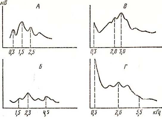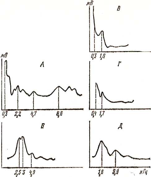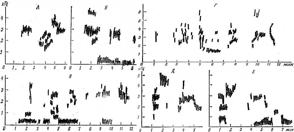 На рис. 14 мы приводим прорисовки сонограмм речевых сигналов, произнесенных женщинами и принадлежащими им волнистыми попугайчиками. Сонограммы выполнены на кафедре зоологии МГУ на сонографе 7800 в режиме до 8 кГц с фильтром 300.
