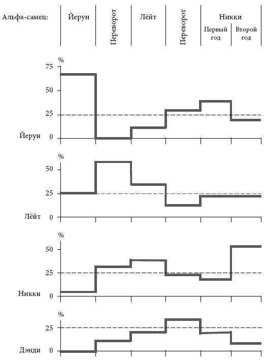 Когда я наблюдаю за шимпанзе в Арнеме, у меня иногда возникает ощущение, что я изучаю первобытную орду Фрейда, словно бы машина времени переместила меня в доисторические времена, чтобы я мог исследовать сельскую жизнь наших предков. Они все еще согласны с droit du seigneur[10] – одним из ныне забытых продуктов западной культуры. Когда Йерун был альфа-самцом, он один отвечал примерно за три четверти всех спариваний. Если не считать половых актов с молодыми самками (которые вызывают не так много соперничества), его доля доходила почти до 100 %. Секс был его монополией в группе. Эта ситуация изменилась, когда Лёйт и Никки восстали против него. Йеруна не разорвали на части, но после этого он уже никогда не смог вернуть себе прежнюю долю половой активности. Кроме того, ни один другой самец не оказался достаточно сильным, чтобы монополизировать самок в течке в той же мере, в какой это удавалось Йеруну в его лучшие времена. С другой стороны, спаривания в период, когда вожаком был Никки, все же не распределялись равномерно между четырьмя самцами группы. Во времена сразу после падения Йеруна сексуальные контакты доставались Никки и прежде всего Лёйту. Доля Йеруна начала расти снова лишь тогда, когда Лёйта сместили (Йерун и Никки), а нового пика она достигла в первый год лидерства Никки; в то время показатель Йеруна был выше, чем у его партнера по коалиции. В следующий год Йеруну пришлось отступить; теперь доля Никки составляла более 50 %. Во все эти годы доля Дэнди оставалась ниже 25 %, если не брать смутных месяцев второго переворота.