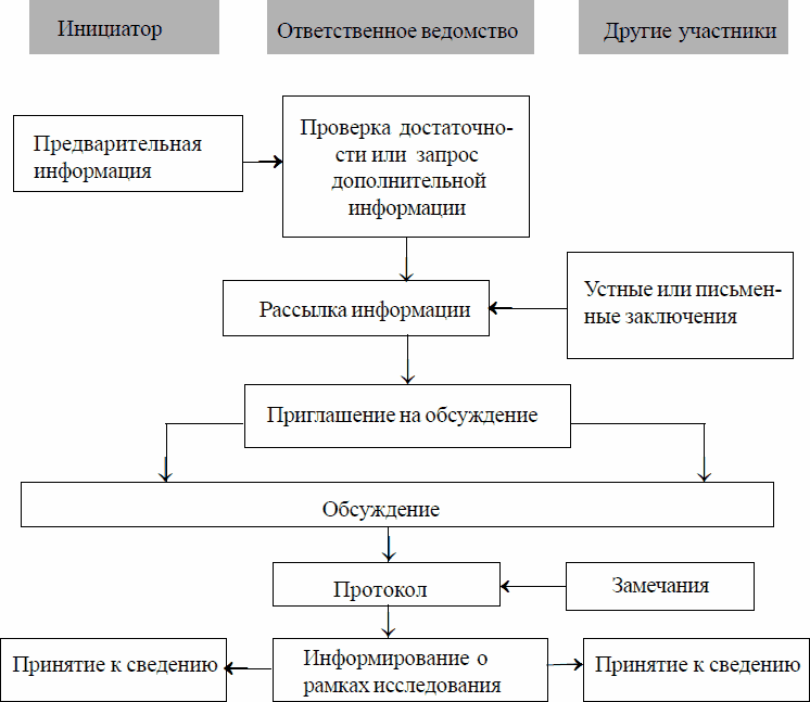 В управленческой практике утвердилась именно такая форма скопинга. Если провести скопинг хочет инициатор деятельности, он передает в ответственное ведомство предварительную информацию о своих намерениях, которая содержит предложения об объеме и содержании исследований, то есть рамки исследований. Основываясь на этой информации, ответственное ведомство проверят с привлечением мнения других ведомств (в том числе природоохранного), достаточны ли эти сведения для проведения обсуждения. Если нет, то у инициатора запрашивается дополнительная информация. Эти сведения ответственное ведомство направляет участникам обсуждения с просьбой дать письменное заключение. К их числу принадлежат специализированные природоохранное и другие ведомства, а также муниципальные власти и признанные природоохранные союзы. После получения устных или письменных заключений ответственное ведомство приглашает всех участников на устное обсуждение. Оно может иметь различные формы – обычное заседание, семинар, осмотр местности и несколько заседаний. Определение формы обсуждения – это компетенция ответственного ведомства. Она выбирается в зависимости от вида намерения/проекта и его потенциального влияния на окружающую среду. Обсуждение протоколируется, в протоколе фиксируются предварительные рамки исследования, протокол направляется всем участникам обсуждения. На этом скопинг заканчивается. Инициатор деятельности в соответствии с установленными во время скопинга рамками исследований приступает к оценке воздействия и подготовке материалов для экспертизы.
