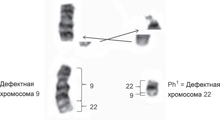 За много лет до этого двое исследователей из Филадельфии обнаружили, что в некоторых клетках у пациентов с ХМЛ 22-я хромосома до странности маленькая. Такую хромосому назвали «филадельфийской». Когда Роули внимательно рассмотрела клетки ХМЛ, применив новые методы окрашивания, она обнаружила, что 9-я хромосома в трех образцах длиннее, чем должна быть. На самом деле, недостающая часть 22-й хромосомы путем транслокации попадала в 9-ю хромосому. Таким образом, генетическая информация в клетках ХМЛ на самом деле не отсутствовала, как полагали ранее, она просто находилась не в том месте (рис. 5.2).