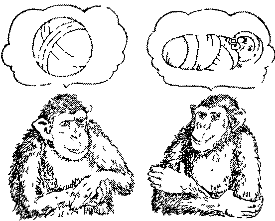 Сам по себе факт заучивания жестов еще не несет в себе ничего принципиально нового — для этого достаточно простого условно-рефлекторного обучения. Тем не менее ряд особенностей использования шимпанзе «словарного» запаса заставлял предполагать, что употребление знаков основано у них на когнитивных процессах более высокого порядка — на обобщении и абстрагировании. Об этом свидетельствует тот факт, что, хотя при обучении использовались, как правило, единичные конкретные предметы, обезьяны применяли усвоенные жесты к довольно широкому набору незнакомых предметов той же категории. Так, например, знаком «бэби» (рис. 6.2) все обезьяны обозначали и любого ребенка, и щенков, и кукол; знаком «собака» — представителей любых пород, в том числе и на картинках, а также лай отсутствующего пса. Шимпанзе одинаково хорошо понимали жесты и когда тренер находился рядом, и когда такие знаки были изображены на фотографиях.