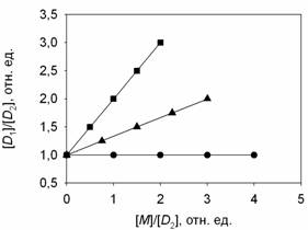 Рис. 1. Метод изохрон. Для определения возраста магматической породы берут несколько ее образцов, различающихся содержанием материнского радионуклида M. Измеряя (например, с помощью масс-спектрометра) концентрации материнского нуклида M, дочернего нуклида D1, а также нуклида D2, являющегося нерадиогенным изотопом того же элемента, что и нуклид D1, строят графики зависимости [D1]/ [D2] от [M]/ [D2]. При отсутствии выноса и привноса нуклидов за пределы породы такой график является прямой линией — изохроной. Изохрона, построенная по точкам с маркерами-кругами соответствует только что извернувшейся породе, с маркерами-треугольниками — породе возрастом в 0,5 периода полураспада радионуклида M, с маркерами-квадратами — породе возрастом в 1 период полураспада радионуклида M.