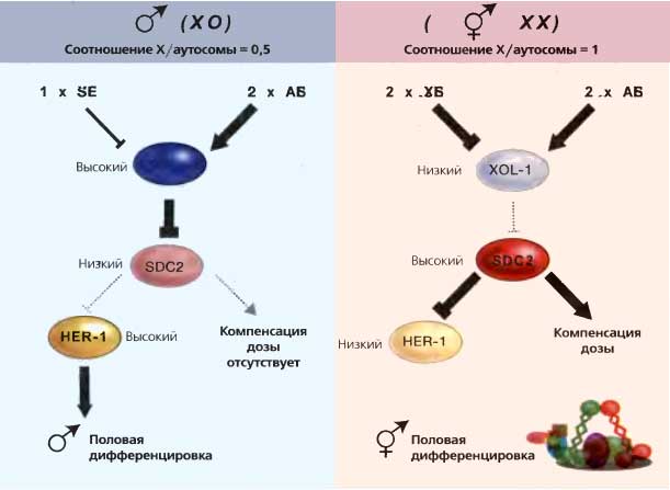 Рабочая гипотеза относительно того, как это разворачивается у обоих полов, заключается в следующем: диплоидные эмбрионы XX вырабатывают двойную дозу XSE-репрессоров xol-1, которые аннулируют активирующее влияние ASEs. Это удерживает XOL-1 на низком уровне и ведет к развитию гермафродита и осуществлению компенсации дозы. Наоборот, диплоидные эмбрионы ХО продуцируют единичную дозу репрессоров XSE, которая недостаточна для противодействия активирующему влиянию ASEs. Высокие уровни содержания XOL-1 приводят к развитию самца и к невозможности выполнить компенсацию дозы. XSEs и ASEs транслируют сдвиг в отношении Х:А от 0,5 к 1 в переключение пола и в решение, осуществлять ли компенсацию дозы или нет.