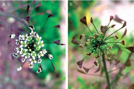 Соцветия пастушьей сумки с цветками дикого типа (а) и с цветками без лепестков (b) (фото из статьи Hintz et al., 2006).