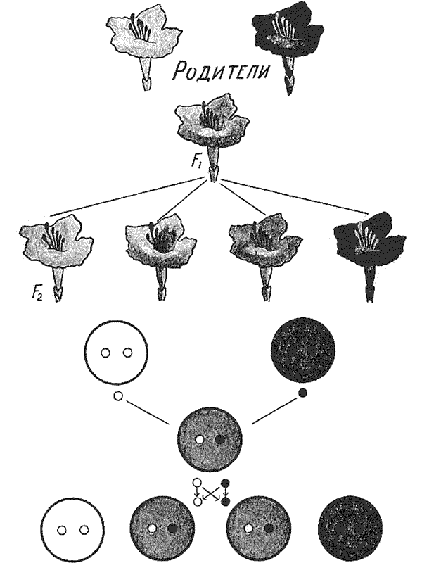 Скрещивание двух разновидностей ночной красавицы — красной и белой. Все дети — розовые. У внуков начинается расщепление признаков — часть их белая, часть красная, часть розовая. Ниже кружками обозначено то же самое. Кружки с одноцветными точками посредине обозначают «чистые линии», кружки с разными точками — помеси, которые снова дадут расщепление.
