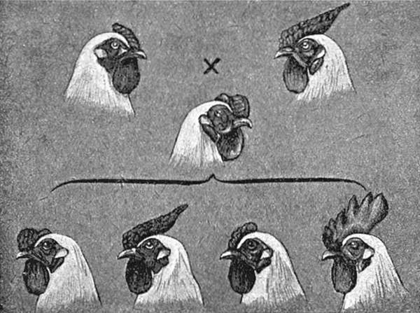 Скрещивание кур с разными гребнями — гороховидным (налево) и розовидным (направо). Дети имеют уже ореховидный гребень, т.-е. не похожи ни на отца, ни на мать. У внуков начинается расщепление: появляются куры с гребнями (слева направо): ореховидным, розовидным, гороховидным и простым.