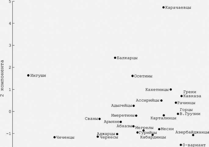 Рис. 62. Положение современных популяций Кавказа в пространстве первой и второй главных компонент (автореферат дисс. докт. биологических наук В.Ф. Кашибадзе «Кавказ в антропоисторическом пространстве Евразии (одонтологическое исследование)». По горизонтальной оси – «1 компонента»-, в которую входят, в частности, «признаки восточной ориентации – дистальный гребень тригонида, лопатообразные резцы и коленчатая складка метаконида». В «2 компоненту» входят, в частности, четырехбугорковые первые нижние моляры и бугорок Карабелли. Примечание: горизонтальная ось (1 компонента) из источника не копируется. Диапазон значений там от -5 (слева) до +2.5 (справа).