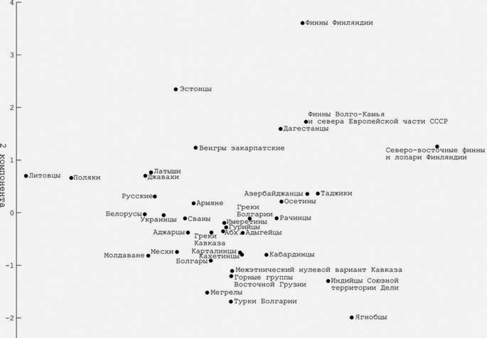 Рис. 63. Положение изученных популяций Евразии в пространстве первой и второй главных компонент (Автореферат дисс. докт. биологических наук В.Ф. Кашибадзе). Примечание: горизонтальная ось (1 компонента) из источника не копируется. Диапазон значений там от -4 (слева)до +4 (справа).