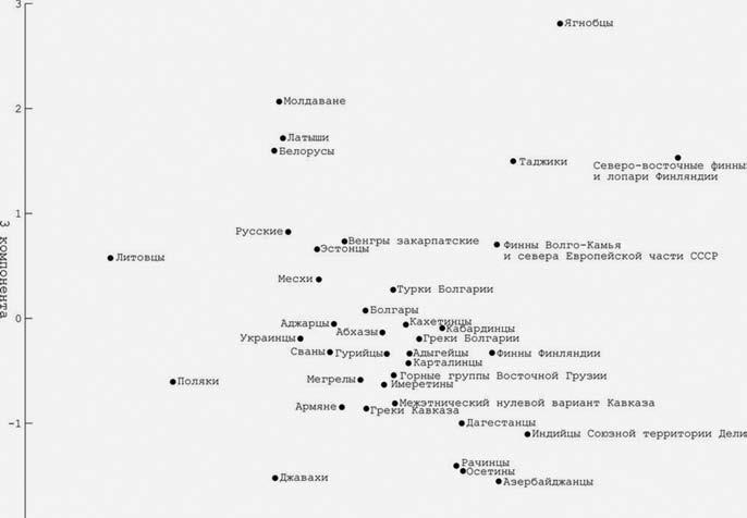 Рис. 64. Положение изученных популяций Евразии в пространстве первой и третьей главных компонент (Автореферат дисс. докт. биологических наук В.Ф. Кашибадзе). Примечание: горизонтальная ось (1 компонента) из источника не копируется. Диапазон значений там от -4 (слева)до +4 (справа).