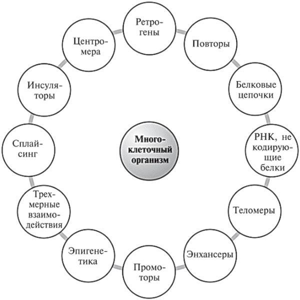 Рис. 20.1. Лишь некоторые из взаимодействующих факторов, которые должны действовать совместно, чтобы создать сложнейший организм, то есть нас с вами.