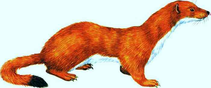 Отряд: хищные. Горностай похож на ласку, но крупнее, и хвост у него имеет черное окончание. Длина до 38 см, хвост — 6-12 см, масса до 200 г. Зимой, как и у ласки, шкурка горностая белеет, остается без изменений лишь кончик хвоста. Питается горностай грызунами, яйцами птиц. Часто, уничтожив грызуна в норке, сам поселяется там. Он ловко передвигается по деревьям, хорошо плавает, может двигаться в толще снега. В помете около 10 детенышей массой в 3–4 г каждый. Распространен от Западной Европы до Дальнего Востока, от полярной тундры до Каспийского моря.
