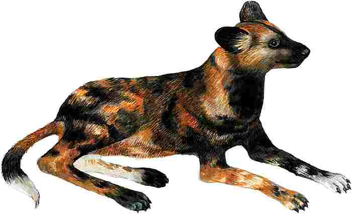 Отряд: хищные. Длина до 1 м, хвост — 40 см, масса — 20–23 кг. Гиеновидные собаки — типичные обитатели саванн, живут и охотятся они стаей в 40–60 животных. В погоне за копытными сменяют друг друга; при загонной охоте одни гонят добычу, другие поджидают ее. В выводке 6–8 щенят. Основные враги — львы, гиены. Сохранились только в национальных парках, находятся под охраной.