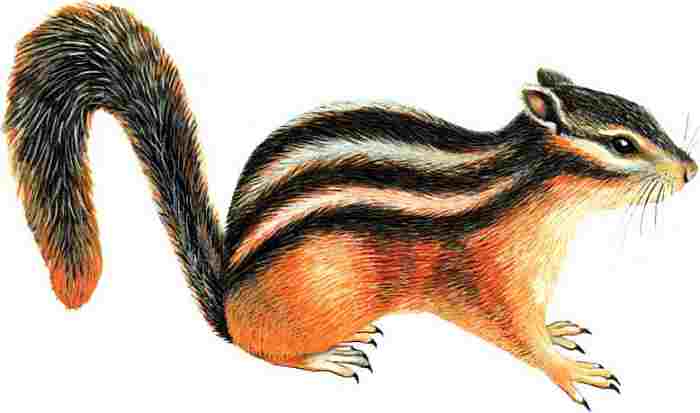 Отряд: грызуны. Небольшой зверек с длиной тела до 15 см; хвост (очень пушистый) — до 10 см. По спине и бокам проходят пять продольных темных полос. Живут в лесах, селятся на опушках, гнезда делают в дуплах, в кучах бурелома. Питаются бурундуки семенами, ягодами, грибами, даже лишайниками. На зиму бурундук запасает до 5 кг провианта — обычно крупных семян и орехов. Этот запас ему нужен в основном для ранней весны, потому что в холода зверек впадает в спячку. В единственном за год приплоде бывает несколько бурундучат. Распространен от Печоры до Сахалина. В Америке обитают очень похожие виды.