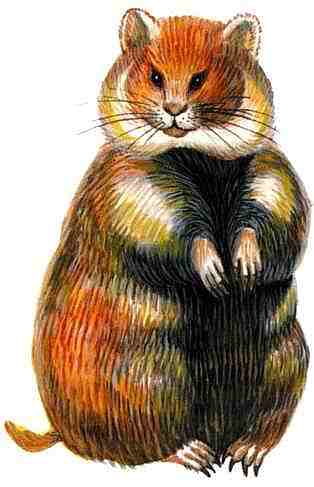 Отряд: грызуны. Золотистый зверек длиной 25–30 см. Живет в степных районах Европы, Западной Сибири, питается растительной пищей, на зиму делает в норе запасы зерна, картошки, моркови общим весом 10–20 кг. Зимой поспит — поест — снова поспит. Запасы нужны и весной. В потомстве до 10 хомячков, а пометов в теплые месяцы бывает 2–3.