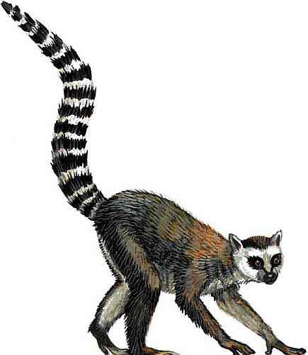 Отряд: приматы. Этот лемур размером с кошку прославился своим роскошным пушистым хвостом, серый мех которого разукрашен белыми и черными поперечными полосками. Живут кошачьи лемуры небольшими стадами по 7-20 животных. Детенышей (в приплоде их 1–2) носят на себе. У новорожденных хвост тоже играет важную роль — им детеныш обвивает мать. Питаются фруктами, яйцами птиц, мелкими животными. Обитают только на Мадагаскаре.