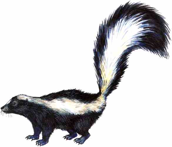 Отряд: хищные. Размеры невелики: длина около 35 см, хвост — до 45 см, масса около 8 кг. Окраска предупреждающая — белые полосы на темном фоне издалека извещают: «Не подходи!» Другие животные, завидев торчащий хвост скунса, торопятся ретироваться. Химическая атака скунса не только отвратительна, но и опасна, она может ослепить. Питаются как животными, так и растениями. В приплоде 5-10 детенышей.