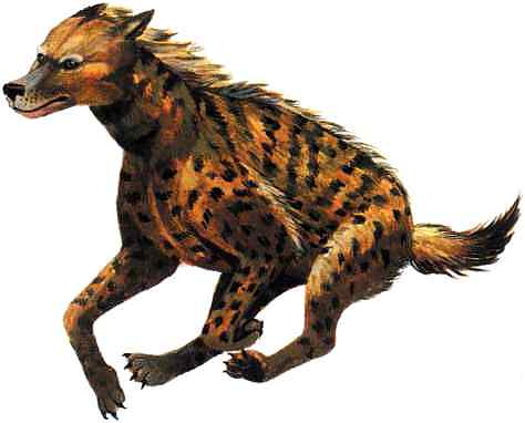 Отряд: хищные. Длина около 1,3 м, а в плечах достигает высоты приблизительно 80 см. Гиена обитает в восточной Африке. Окраска у гиены пятнистая: темные пятна на рыжеватом фоне. Щенится в период дождей или весной. Логовище гиены — впадина в земле, где она рождает обычно четырех щенят.