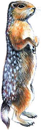Отряд: грызуны. Это самый малый из сусликов: длина тела до 20 см, хвост — 3–4 см. В старых норах обычно насчитывается до 40 ходов, над которыми поднимаются бугры земли до 0,5 м высотой. Питаются суслики преимущественно сочными частями растений. В потомстве 5–9 детенышей, мать копает для них новые норы, куда они вскоре и переселяются. В России встречается на Кавказе, в низовьях Волги.