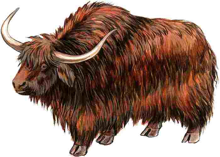 Отряд: парнокопытные. Это крупное животное из группы быков достигает в холке высоты около 2 м, массы — до 100 кг. На холке у яка небольшой горб, рога имеют длину около метра, шерсть густая и ровная, а на ногах, боках и брюхе — длинная и косматая, образующая характерную «юбку», позволяющую легче переносить холод. Хвост похож на лошадиный. Яки — горные животные, они поднимаются в горы до высоты 5000 м. Родина этих животных — Тибет. Живут яки группами по 3–5 животных, в потомстве один теленок, который до года находится при матери. Яки не только организуют круговую оборону от хищников (в центре круга коровы с телятами), но и энергично отбиваются от них. В пургу яки-самцы окружают коров и телят и защищают их от ветра и холода.