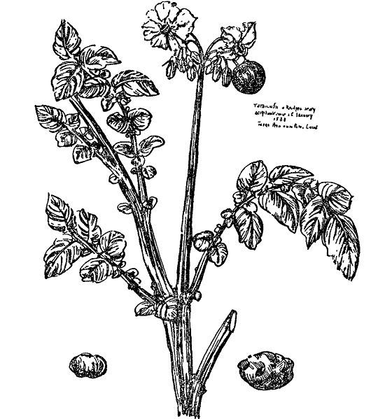 Само слово «картофель» пошло от итальянского tartufo — трюфель. Трюфели — съедобные, но не слишком популярные у нас грибы, чьи плодовые тела, общими очертаниями действительно напоминающие клубень картофеля, развиваются в земле. Они были известны европейцам очень давно и поэтому сравнение с ними клубней, появившихся позже картофеля, вполне объяснимо. Рисунок 17 воспроизводит изображение картофеля, сделанное с экземпляра, выращенного в 1588 году на правах заморской редкости в венском ботаническом саду Шарлем д’Эклюзом. Надпись гласит: «Тартуфли или перуанский папас». Первое название — видоизмененное итальянское, второе — испанское, бытующее до сих пор (papa). С XVIII века слово «тартуфо» уже появляется в немецком языке в его современном виде Kartoffel и, в свою очередь, дает целый веер русских вариаций: картошка, картоха, картопля и так далее. Однако в болотовском «тартофеле» звучат еще отголоски итальянского tartufo.