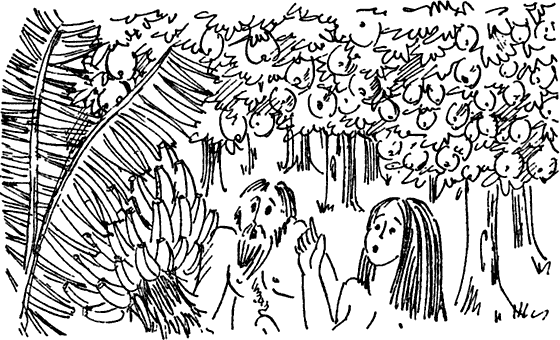 Происхождением только что упомянутого эпитета мы обязаны библейской легенде об Адаме и Еве, где рассказывается о том, как дьявол совратил их попробовать плод с древа познания. С давних времен богословы ломали копья, пытаясь отыскать ботанический эквивалент растущим в раю яблокам, и это нашло свое отражение в языке. Райским яблоком назвали немцы (Paradies apfel) и итальянцы (poma di paradiso) некоторые цитрусовые. Французы же плодом Адама (pomme d’Adam) окрестили… банан! Именно так назван банан и в упомянутом уже «Дикционере» Кондратовича. Но, пожалуй, первым подобное отождествление сделал в XVI веке английский ботаник Джерард, у которого это растение фигурирует как «Adam’s apple tree» — яблоня Адама. Райским же деревом банан чтили издавна, например, арабы. Так или иначе, но легенды и верования отразились и в латинском названии Musa paradisiaca — банан райский. У нас райскими яблочками обычно называют мелкоплодную китайку (Malus baccata).