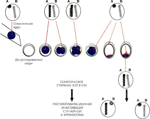 Рисунок иллюстрирует донорскую клетку XX с инактивированной Х-хромосомой (А), покрытой Xist-PHК (зеленая линия) В этой модели транскрипция с донорского ядра, включая Xist-PHK, репрессирована факторами ооцита до 2-клеточной стадии, приводя к реактивации X. Затем, на 2-клеточной стадии экспрессия Xist возобновляется. Затем Xist реэкспрессируется вновь с аллели неактивной X от донорской клетки. Это можно было бы приписать сохранению такой метки, как метилирование ДНК в промоторе Xist Этот паттерн поддерживается в клетках, относящихся к линиям ТЕ и РЕ, но не в плюрипотентном эпибласте, где экспрессия Xist вновь прекращается, приводя ко второму событию реактивации. В ICM стирание эпигенетических меток, управляющих экспрессией донорского Xist, делает возможной последующую случайную Х-инактивацию в собственно эмбрионе