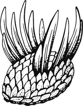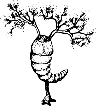 Название галлюцигении говорит само за себя. Ее вытянутое пятисантиметровое червеобразное тело с одной стороны заканчивалось довольно тяжелой головой с вроде бы глазами, из тонкой шеи в стороны тянулись три пары щупалец, на животе было семь пар толстых недоножек с фирменными коготками, а на спине – тоже семь пар очень длинных шипов. Эти пики при большом увеличении чрезвычайно красивы, так как покрыты мельчайшим чешуйчатым узором; между прочим, такие щетинки давно были известны как конодонты Rhombocorniculum. Примечательно, что от ранних китайских видов к позднему канадскому длина шипов росла, стало быть – была надобность, хищники тоже хотели кушать.