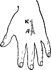Опустите правую руку вниз и подождите, когда кровеносные сосуды на верхней поверхности кисти нальются кровью. По голубоватому цвету этих сосудов нетрудно убедиться в том, что это вены. Стало быть, кровь течет в них от концов пальцев вверх по руке, по направлению к сердцу. Прижмите пальцем левой руки вену в том месте, где она составляется из двух вен (на рисунке, стр. 177, это место обозначено буквой А), а другим пальцем выдавите из нее кровь по направлению вверх. Вы заметите, что вена сделалась пустой, но только на небольшом расстоянии. Немного выше она будет налита кровью, и граница между пустым местом и наполненным кровью будет обозначена очень резко. На этой границе находится клапан (К), который открывается только в одном направлении, именно по пути движения крови. Он не позволяет крови двигаться назад, почему участок вены ниже этого клапана оказывается пустым. Теперь отнимите палец, которым вы прижимали вену, и вы заметите, что этот пустой участок тотчас же наполнится кровью.