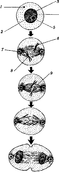 Схема деления клетки (митоза): 1 — центриолъ; 2 — ядро; 3 — ядерная оболочка; 4 — ДНК; 5 — ядрышко; 6 — хромосомы; 7 — центриолъ со звездой микротрубочек; 8 — центромера; 9 — веретено деления
