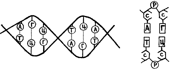Развернутая молекула ДНК похожа на длиннющую веревочную лестницу с частыми перетяжками — «ступенями». Каждая половинка этой «лестницы» или, как чаще говорят, двойной спирали представляет собой длинную цепочку сложных молекул, называемых нуклеотидами. (Слова «нуклеотиды» и «нуклеиновая» кислота происходят от латинского слова nucleus — ядро.) Всего в ДНК встречается 4 типа нуклеотидов: аденин, гуанин, цитозин и тимин, которые принято обозначать буквами А, Г, Ц и Т. В последовательности нуклеотидов цепочки ДНК зашифрована вся наследственная информация; это как бы «буквы» генетического алфавита.