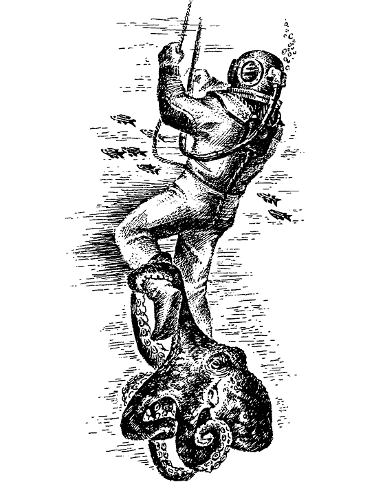 В одном из номеров «Эплтон америкэн джорнэл оф сайенс энд арт» корреспондент сообщил об осьминоге, напавшем на водолаза, когда тот обследовал корпус затонувшего парохода. Судно лежало на дне океана, близ Флориды. Водолаз по прозвищу Буйный Ирландец оказался совершенно беспомощным под водой — его вытаскивали за страховочный трос. Оказавшись на палубе, он потерял сознание. Компаньоны не могли оторвать от него осьминога до тех пор, пока крепко по нему не ударили.