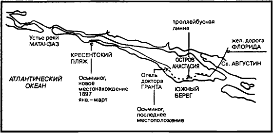 Карта, на которой указано расположение тела флоридского монстра. С рисунка-карты Рэя Маккала.